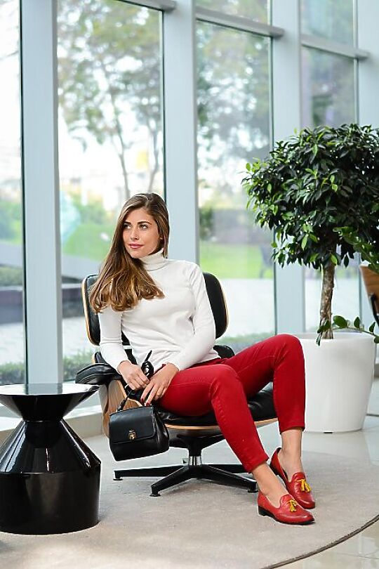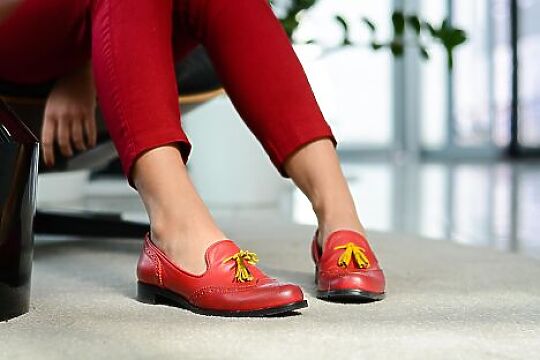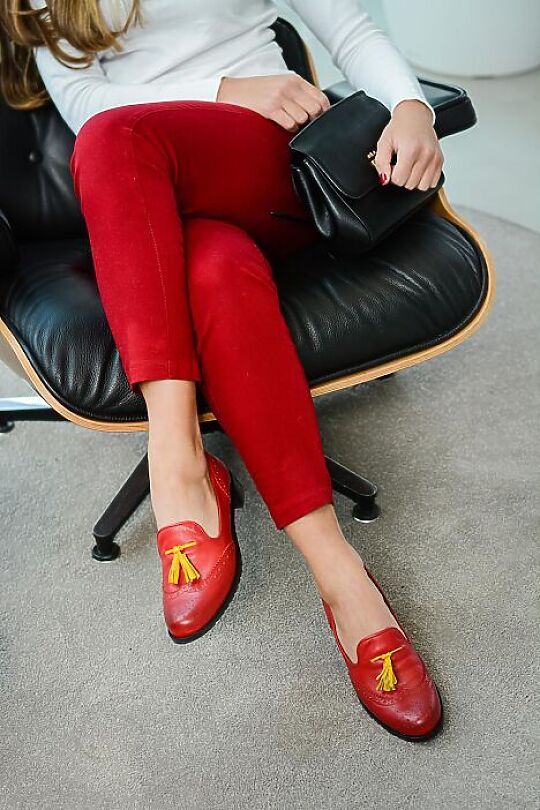 The model has a classic, slightly elongated silhouette in bright, red colour. The delicate perforated openings and fashionable tassels in yellow with metal elements add a spectacular ending to the shoes. The model is designed in a modern, gradated playing shades.